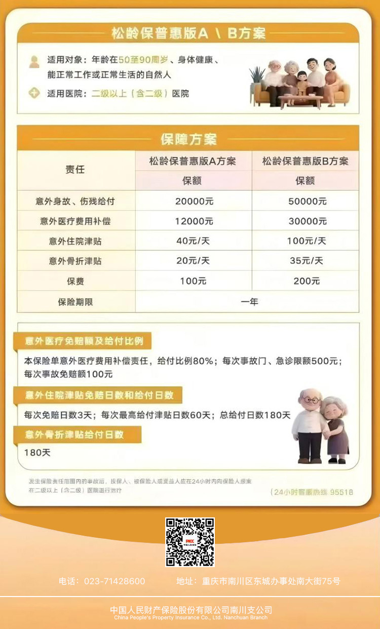 中国人民财产保险股份有限公司推出的这款人保松龄保普惠版,凭借其全面的保障、灵活的方案和实惠的价格,为老年人的意外风险保障提供了优质选择。给父母一份人保松龄保,就是给他们的晚年生活送上一份稳稳的幸福,让他们在岁月的长河中,能更安心、更有底气地享受生活。