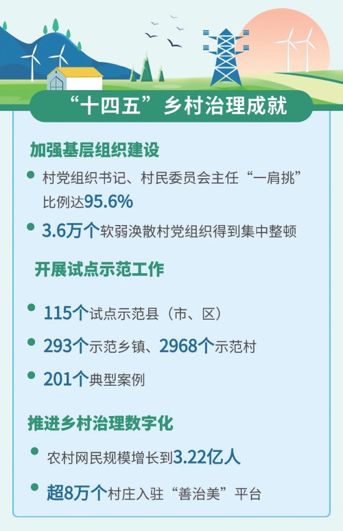 基层强则国家强,基层安则天下安。乡村治理是国家治理的基石,也是乡村振兴的基础。“十四五”期间,各地围绕党中央、国务院关于“健全党组织领导的自治、法治、德治相结合的乡村治理体系”要求,建设充满活力、和谐有序的乡村社会,不断增强农民群众的获得感、幸福感、安全感。