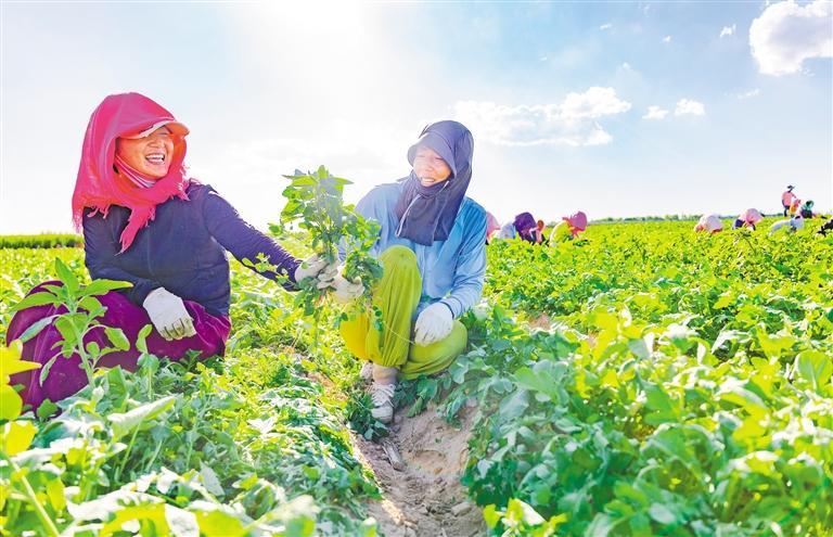 7月29日,吴忠市富阳农业集团种植基地,村民在除草。近年来,吴忠市大力发展牛乳、葡萄酒、滩羊、牛肉、黄花菜、冷凉蔬菜等特色农业产业。