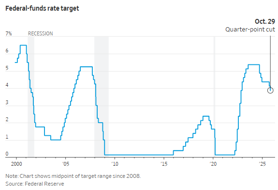 无论如何,最新的25个基点降息,将使美联储的基准短期利率降至3.75%至4%的区间,这是三年来的最低水平——同时也已大幅低于了去年大部分时间该联储维持的约5.4%的峰值。美联储此次降息旨在防止近期招聘放缓的势头进一步恶化。