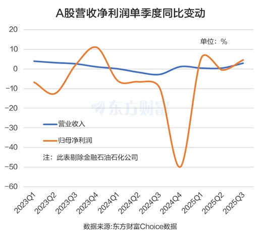 剔除金融石油石化后,A股上市公司第三季度实现营业收入14.4万亿元,同比增长2.93%;实现归母净利润0.75万亿元,同比增长4.6%。