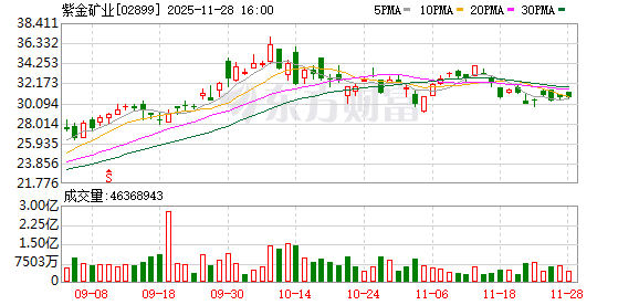 截至11月28日收盘,紫金矿业A股最新市值为7595.86亿元。