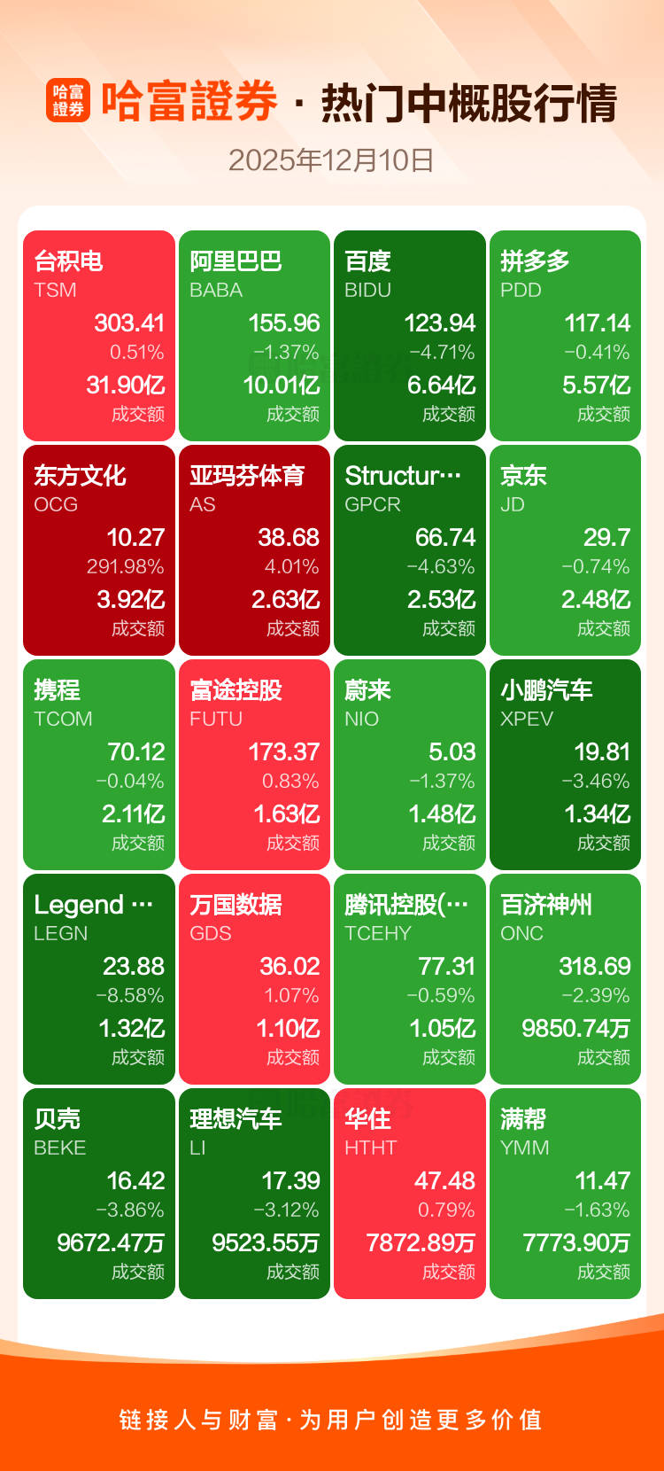 台积电涨0.51%,阿里巴巴跌1.37%,百度跌4.71%,拼多多跌0.41%,东方文化涨291.98%,亚玛芬体育涨4.01%,Structure Therapeutics Inc ADR跌4.63%,京东跌0.74%,携程跌0.04%,富途控股涨0.83%。