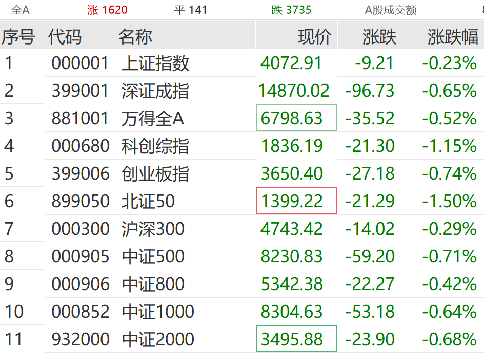 4月21日,A股主要指数集体低开:上证指数跌0.15%,深证成指跌0.31%,创业板指跌0.42%。随后市场震荡走低,截至发稿,主要指数集体飘绿,科创综指、北证50指数跌超1%。