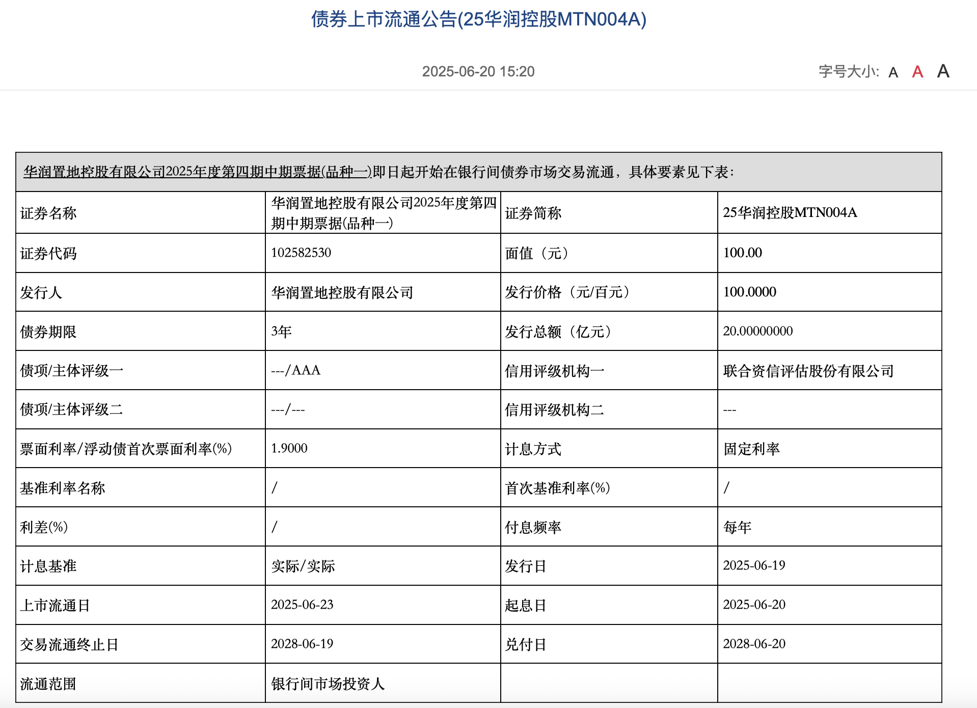 6月19日,华润置地控股有限公司(以下简称“华润置地控股”)发行2025年度第四期中期票据,分别为25华润控股MTN004A、25华润控股MTN004B,发行总额合计30亿元。