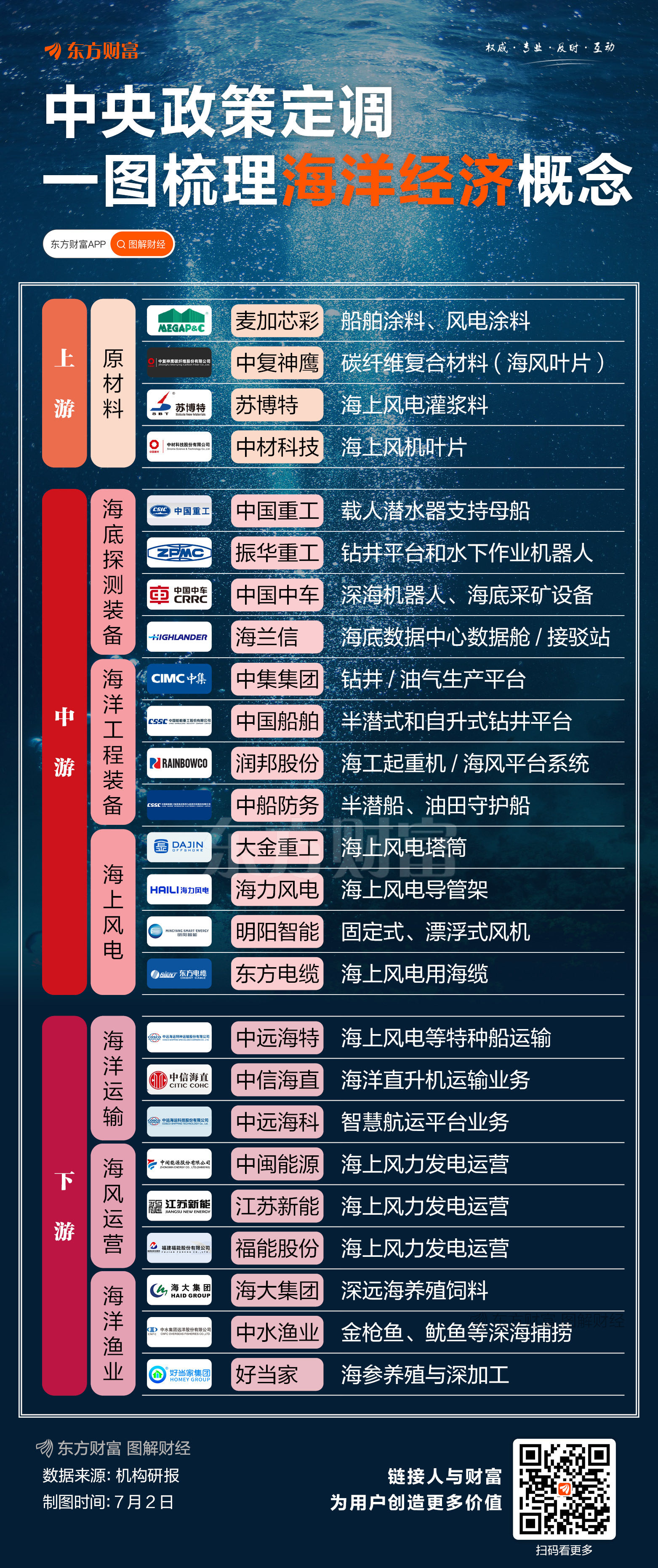 国金证券研报显示,海洋经济从产业链来划分,可以分为上游原材料、中游制造(海上风电&海底探测&海工装备)、下游应用环节(海洋运输、海上风电运营、海洋渔业)。