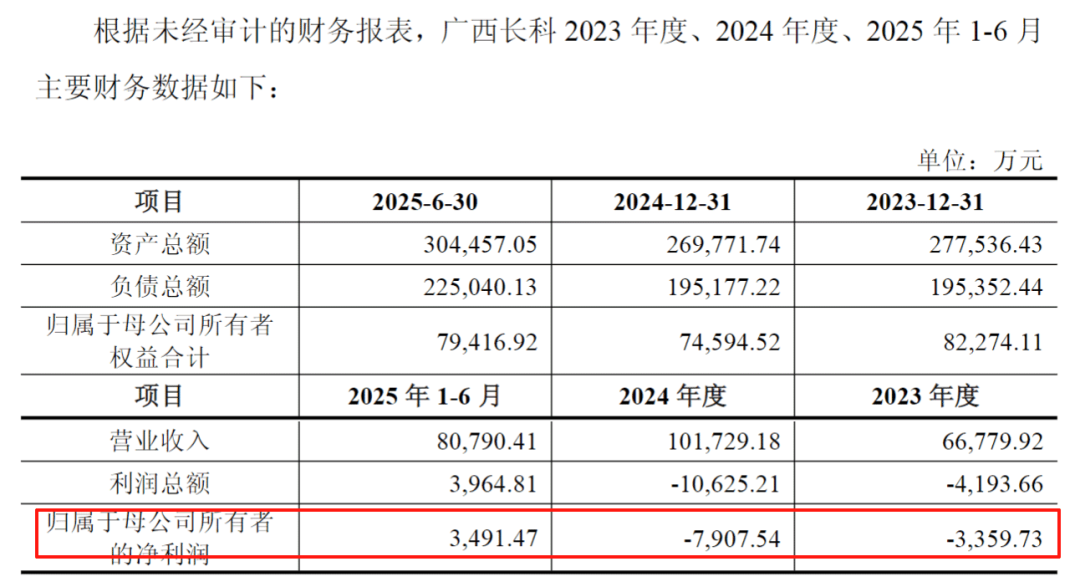 公告显示,广西长科2023年、2024年、2025年1—6月归母净利润分别为-3359.73万元、-7907.54万元、3491.47万元。