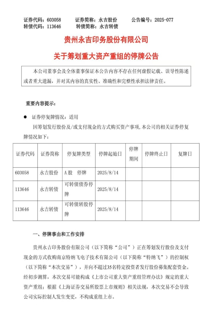 8月13日晚,永吉股份(603058)发布公告称,公司正在筹划发行股份及支付现金的方式收购南京特纳飞电子技术有限公司的控制权,并向不超过35名特定投资者发行股份募集配套资金。此次交易可能构成重大资产重组,不会导致公司实控人发生变更,不构成重组上市。