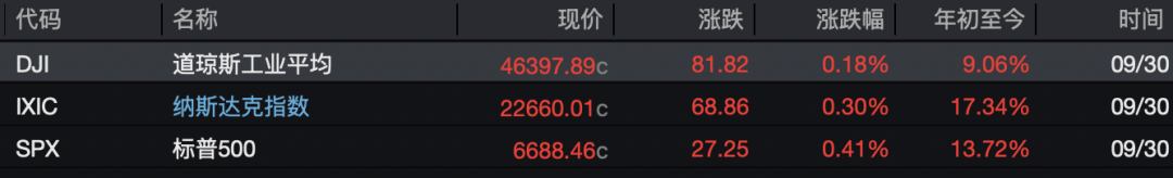 当地时间周二(9月30日),美国股市三大股指小幅收涨,其中道琼斯工业指数涨0.18%,报46397.89点,标普500指数涨0.41%,报6688.46点,纳斯达克指数涨0.3%,报22660.01点。