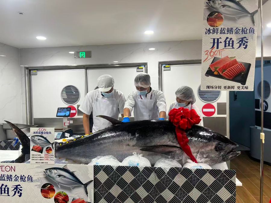 360斤的蓝鳍金枪鱼正被工作人员摆放在冰袋上,准备在整点举行开鱼秀;鲜切牛肉的摊位,穿成串的牛肉串逐渐垒满料理台……这些场景都是广州商超换新升级后的冰山一角。