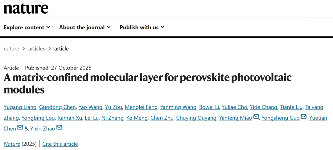 据上海交通大学微信公众号,近日,《Nature》在线发表了上海交通大学环境科学与工程学院赵一新教授团队题为“A matrix-confined molecular layer for perovskite photovoltaic modules”的研究论文。该研究创新性地提出一种“基质限域分子层”型空穴传输层构型新概念,突破了传统自组装单分子层(SAM)型空穴传输层体系中面临的分子聚集、堆叠和结晶的本征限制,创制了分子适用性广、工艺推广性高的电荷传输层新技术路径,解决了基于自组装电荷传输层的钙钛矿光伏模组制备过程中面临的薄膜不均匀、界面不稳定难题。最终,通过与宁德时代21C创新实验室合作,该研究成功实现光电转换效率超过20%的1m×2m大尺寸钙钛矿光伏模组,创造了当前该领域的世界纪录。